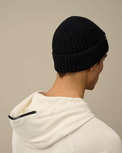 Navy lightweight Goggle beanie crafted in extra fine merino wool.