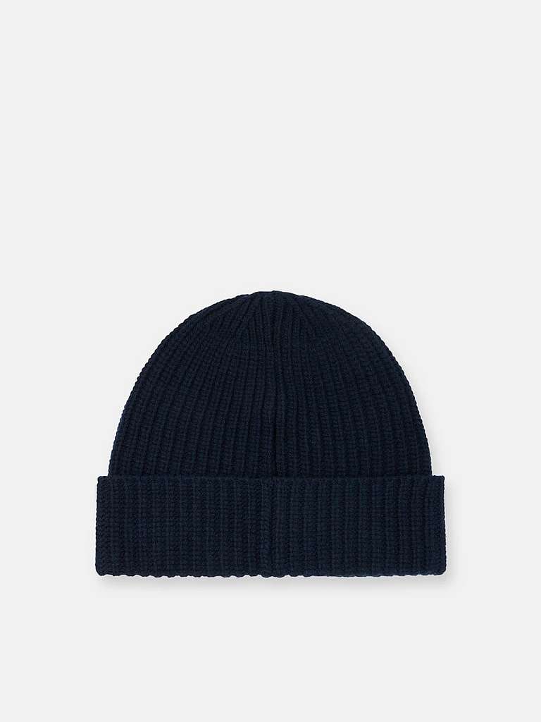 Knit beanie in light RWS Geelong wool with stocking stitch, featuring a ribbed cuff and Compass logo patch on the front. Gauge 5.