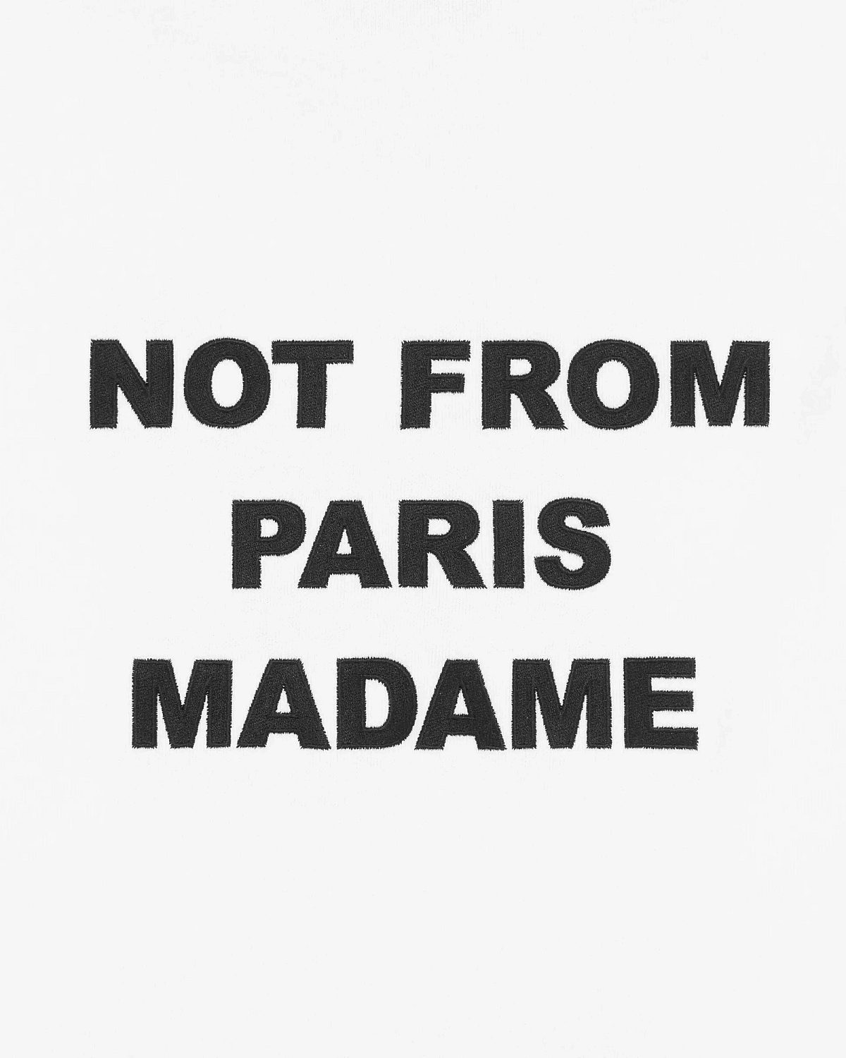 This white 100% cotton French terry hoodie with ribbed hem and cuffs is printed with the 'Not From Paris Madame' slogan on the front and embroidered on the back.