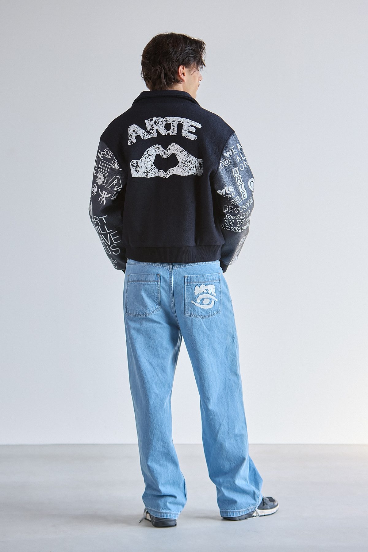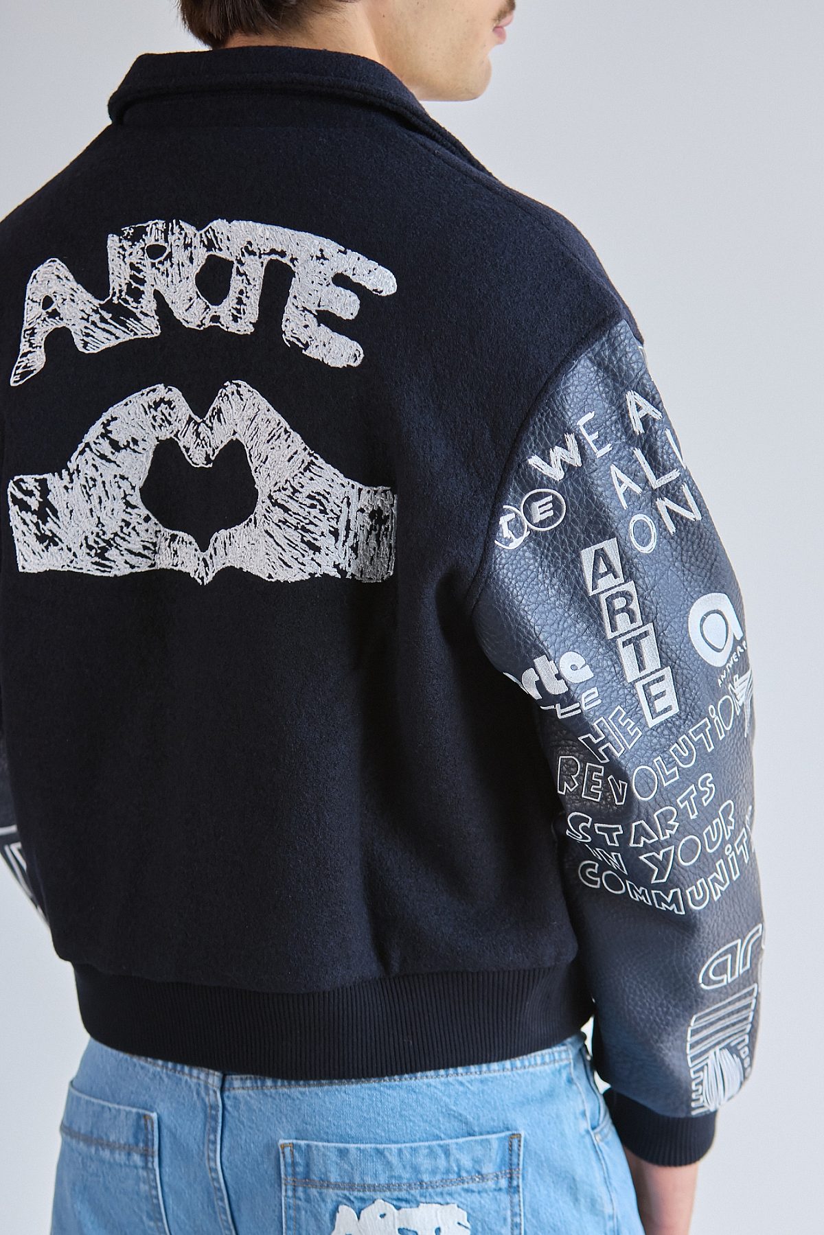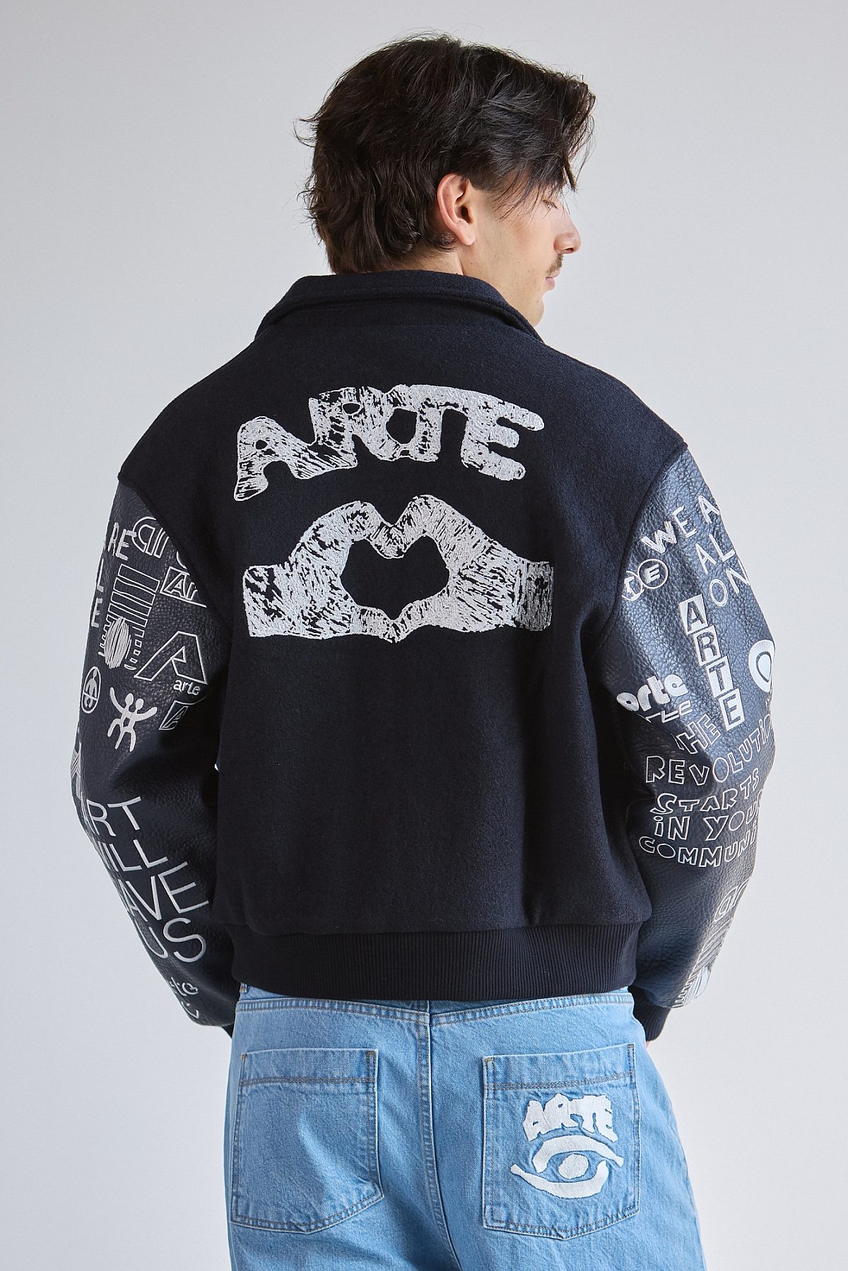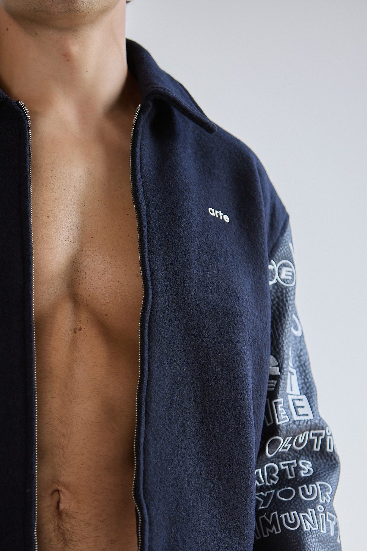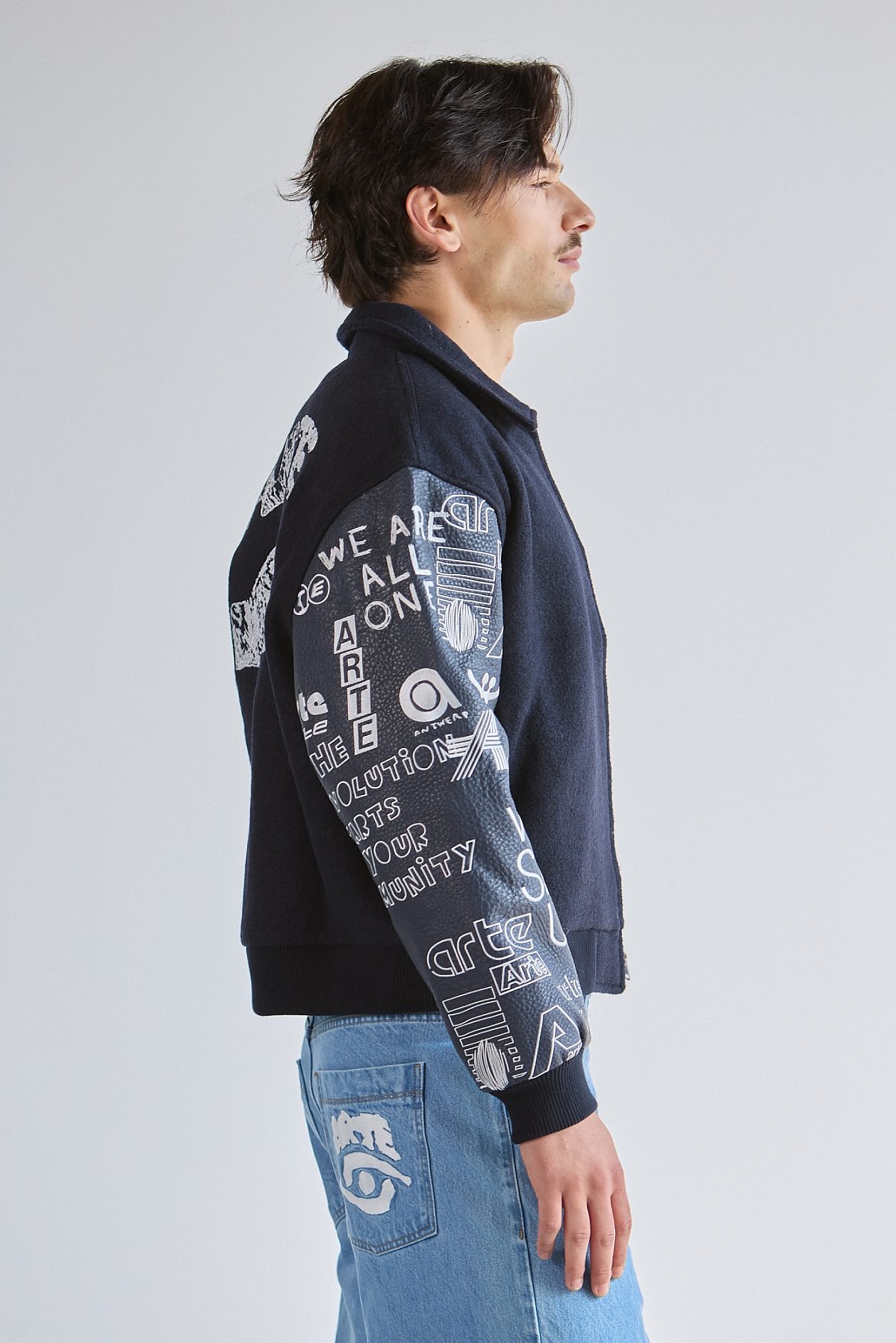 Designed in a faux leather and boiled wool combination, this navy colored jacket is a statement piece for every season. It offers effortless style, topped off with various white colored seasonal graphics across the back and arms. The jacket has a zipper closure, two side pockets, elasticated trims and is finished with a tonal metal logo on the left of the chest.