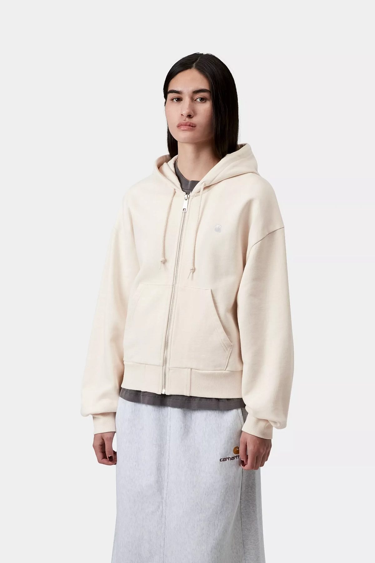 Made from heavyweight 12.3 oz cotton jersey, the Women's Hooded Casey Jacket is cut to a balloon fit, which is a little looser and boxier, but also characterized by dropped shoulders and ribbed cuffs that create a cinching effect. The jersey fabric has also been brushed to give it a fleece-like backing. An embroidered silver-tone 'C' Logo appears on chest.