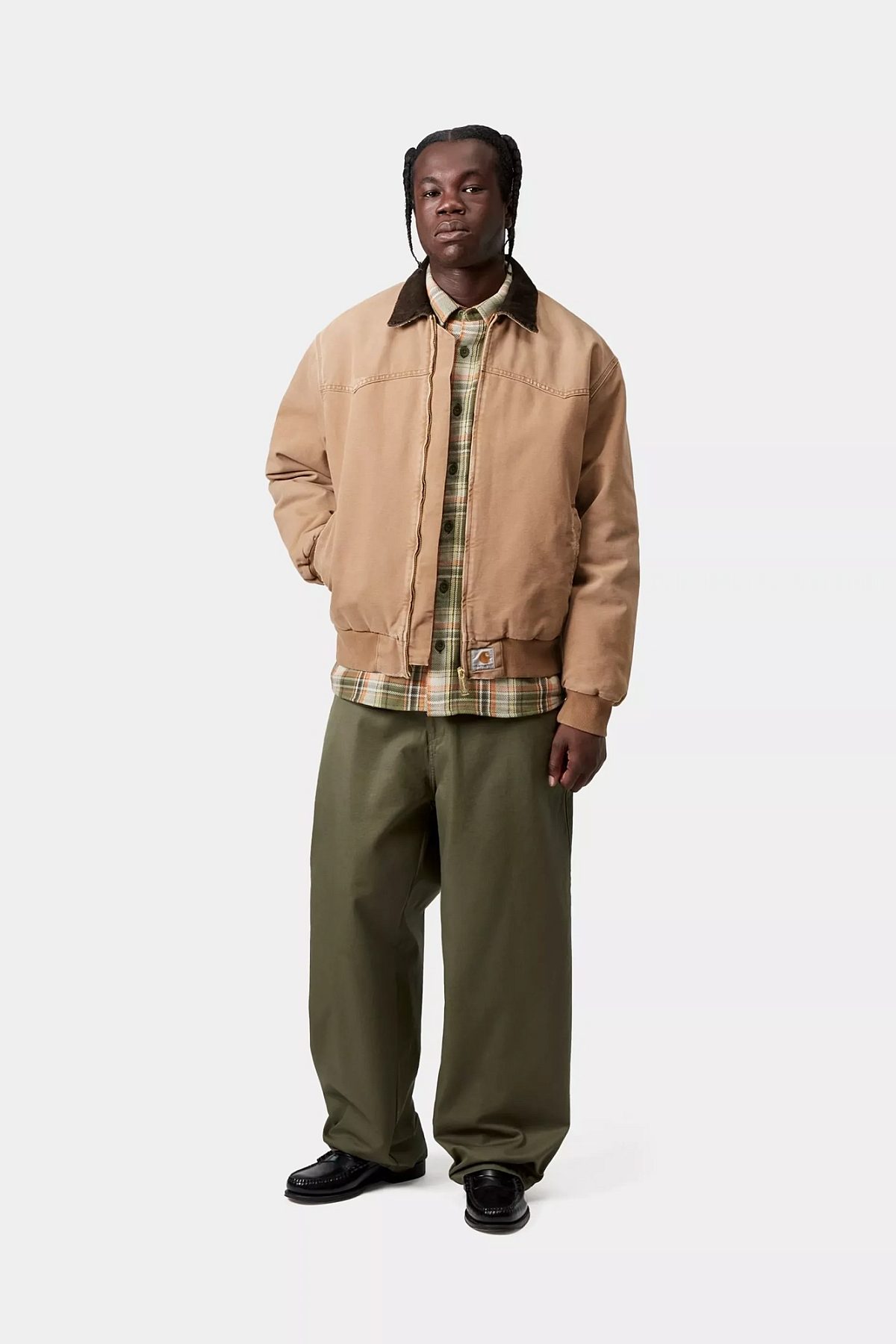 The OG Santa Fe Jacket is constructed from heavyweight Dearborn Canvas with a diamond-quilted lining. The item is made in our original loose fit, which is slightly boxier and more oversized. It also features rib-knit trims. A corduroy collar, side pockets, and a chest pocket on the inside offer functional touches, while triple-stitch details provide extra durability. A woven Square Label completes the design.