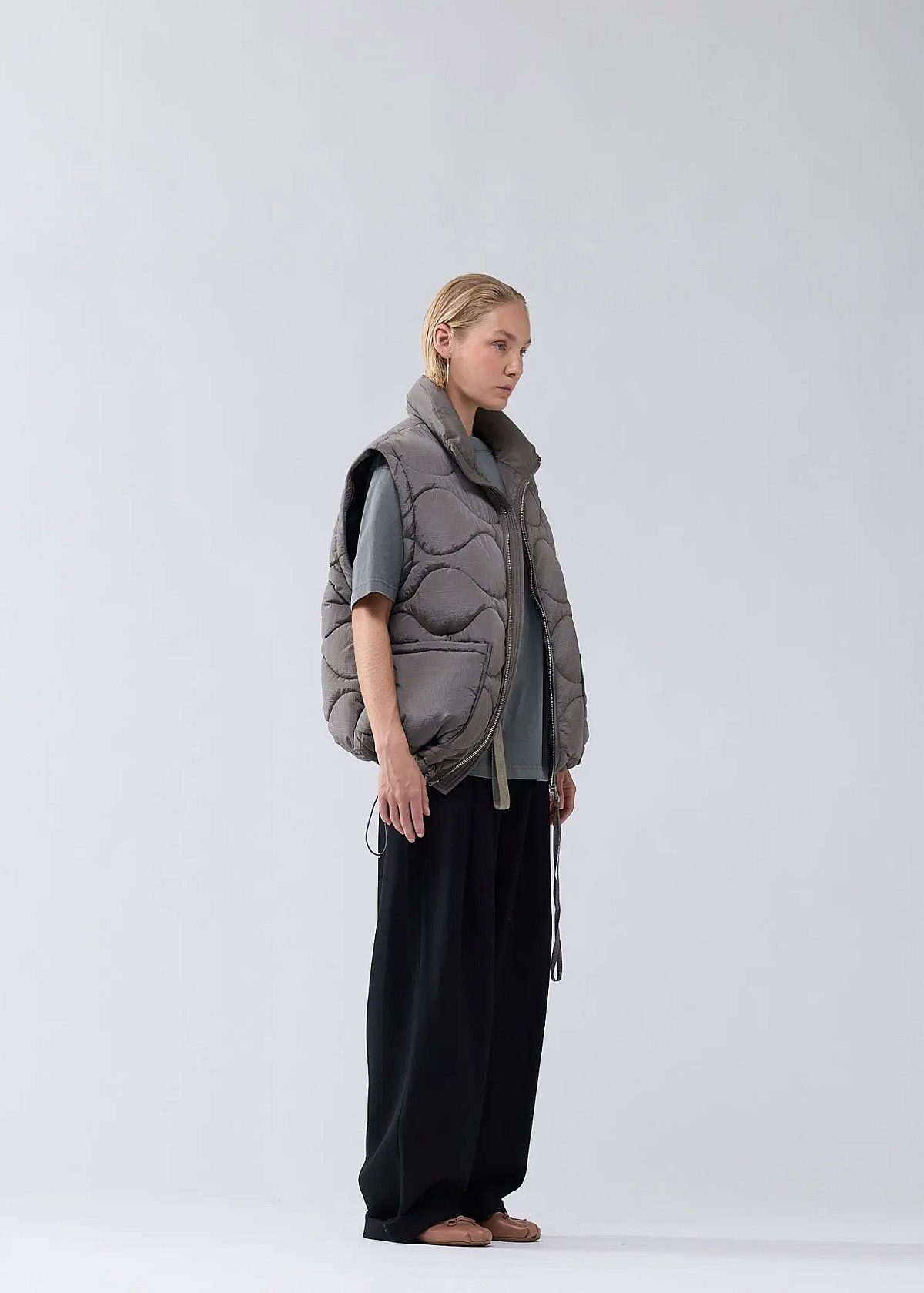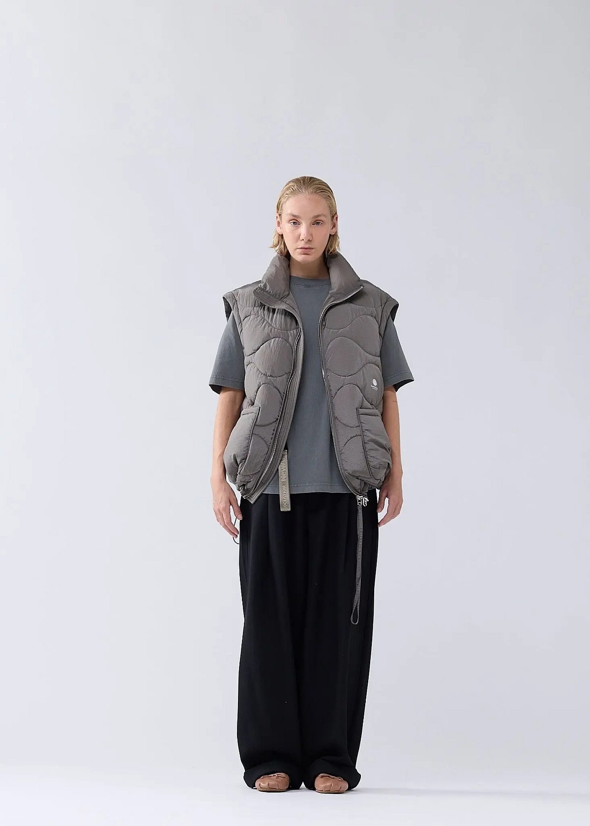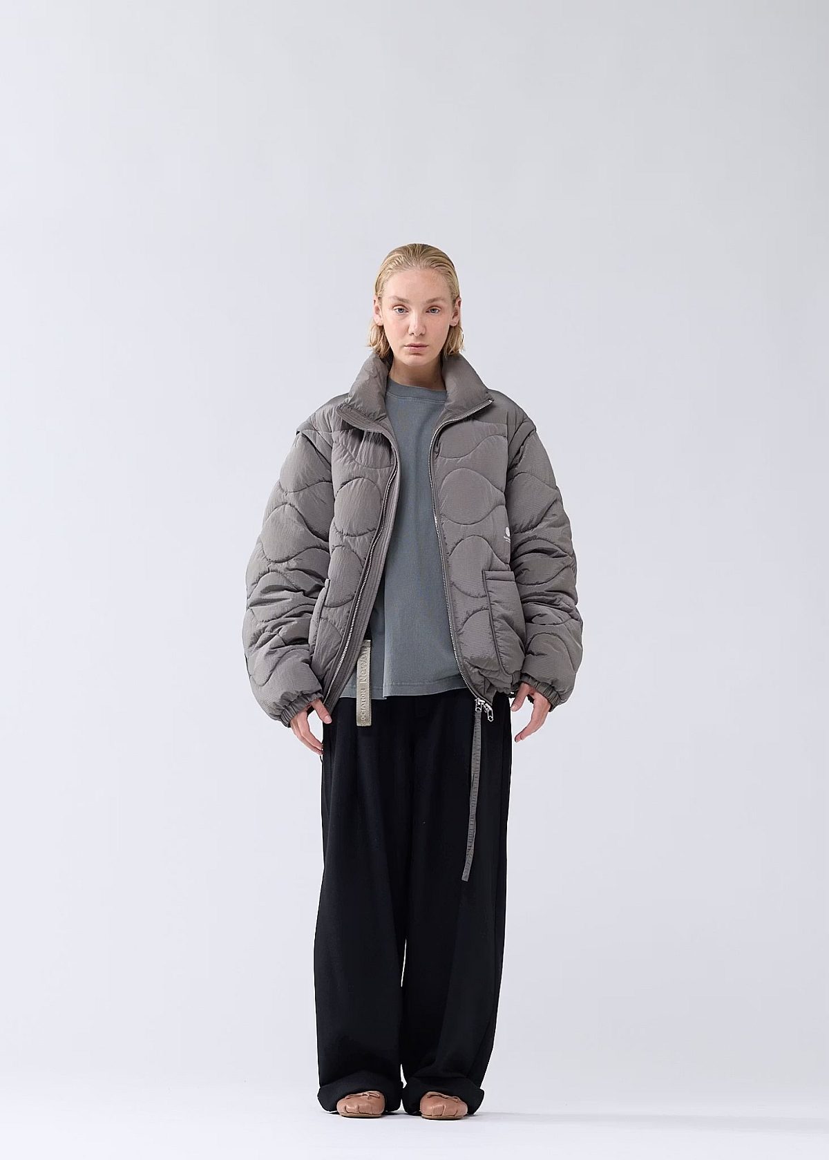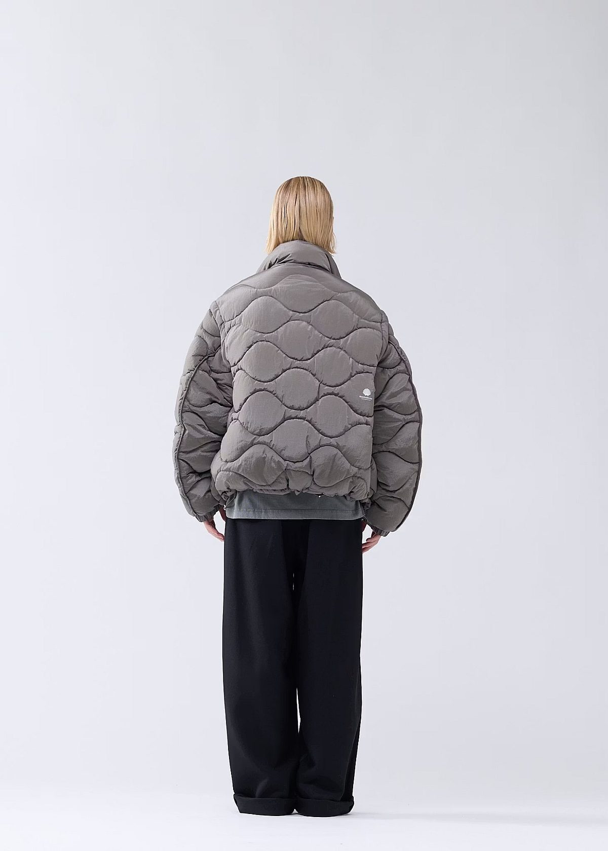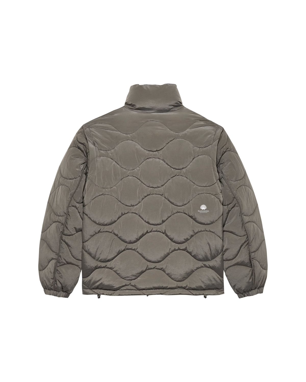 This jacket is made out of a shiny ripstop nylon. It is styled with a metal double zipper front patch pockets and a classic onion quilt. Front and back of the jacket are branded with a white screenprint logo. The bottom hem contains an elastic drawcord with branded cordstoppers. The jacket has got a regular unisex fit with padded silhouette.