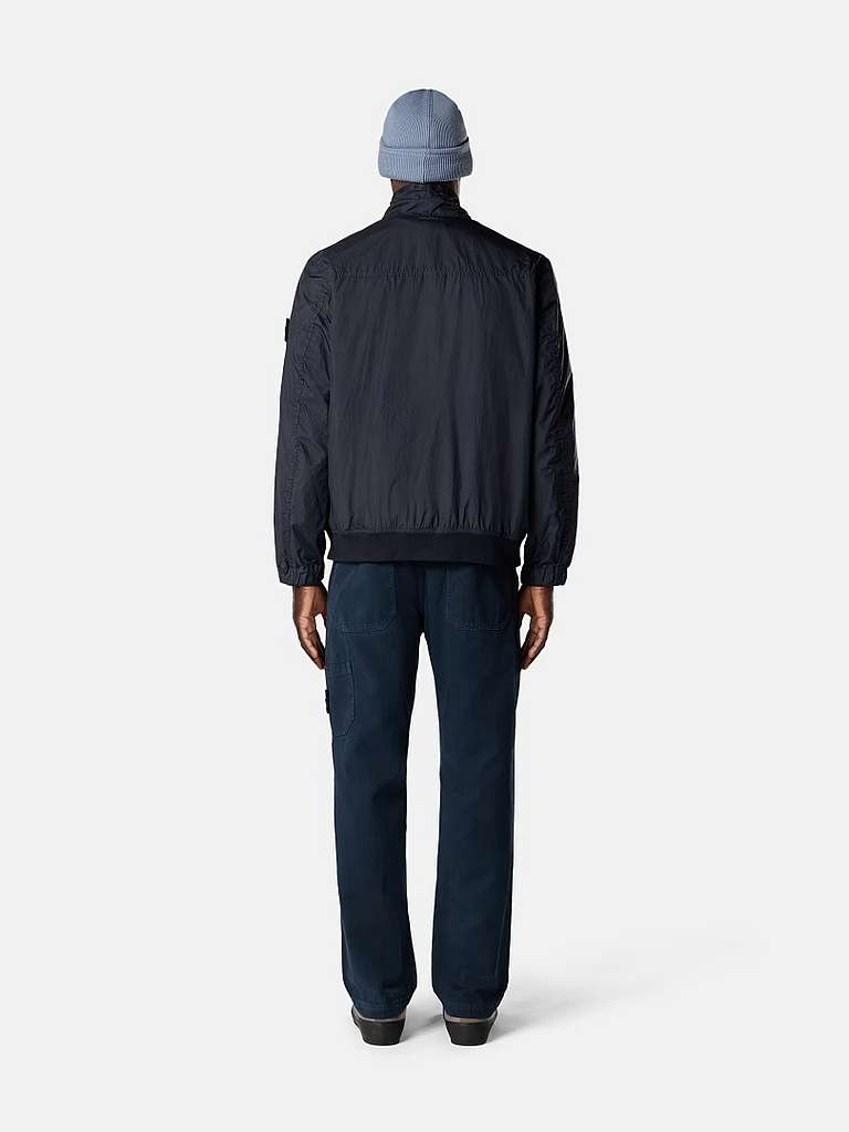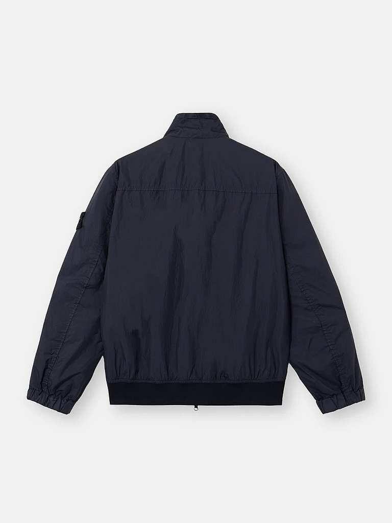 Stand collar jacket in light recycled nylon rep with a crinkled appearance, featuring snap-fastened pockets, elasticated cuffs, and a two-way zip. Garment dyed with anti-drop.