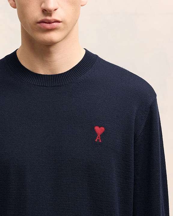 Pull col rond broderie Ami de Coeur en laine mérinos, navy blue.