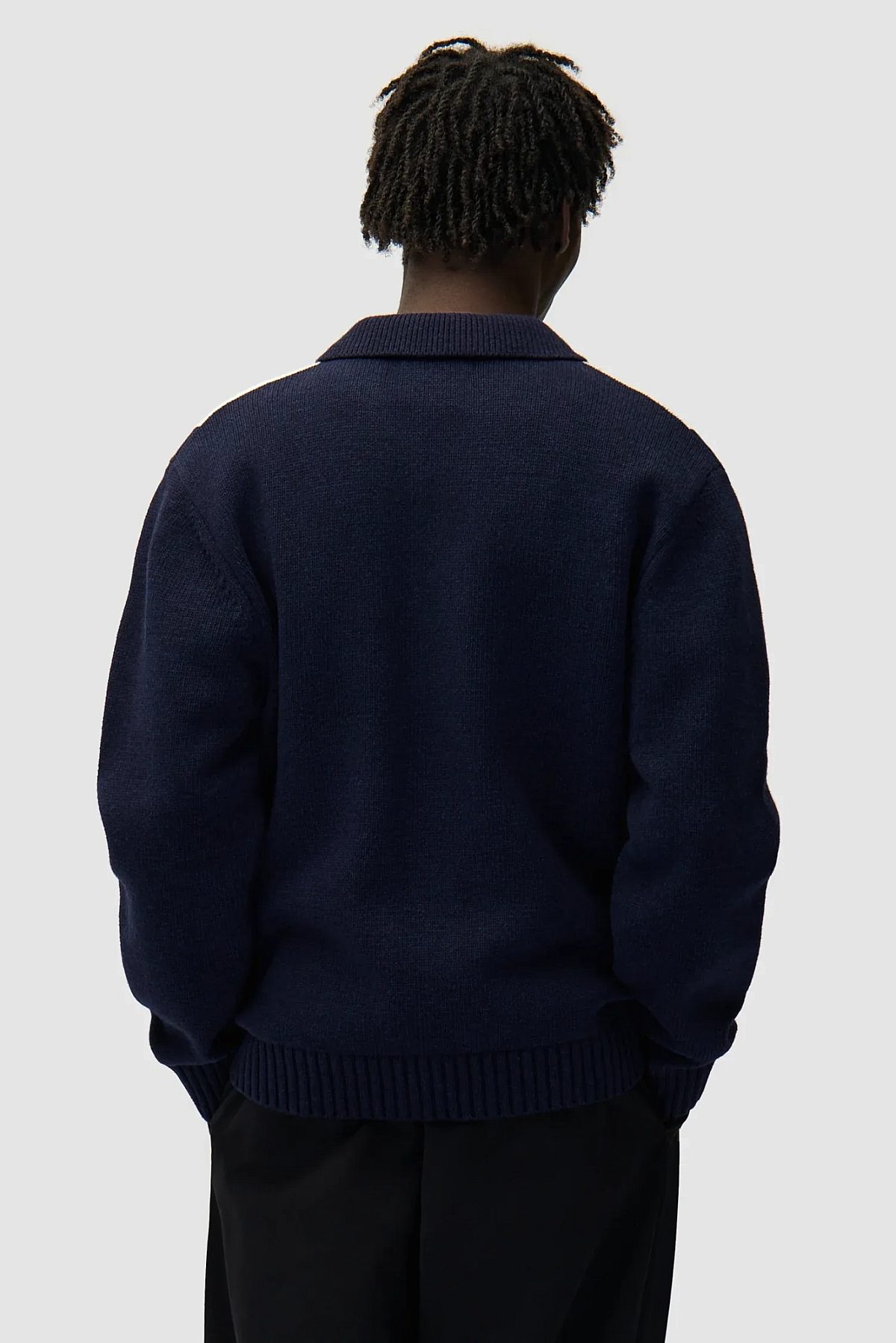 The Cardigan functions as a cozy extra layer that adds both style and comfort to your outfit. Made from premium wool blend, it features a striped design consisting of contrasting shades of navy and cream. Finished with a full length zipper in the front and a navy embroidery on the left chest.
