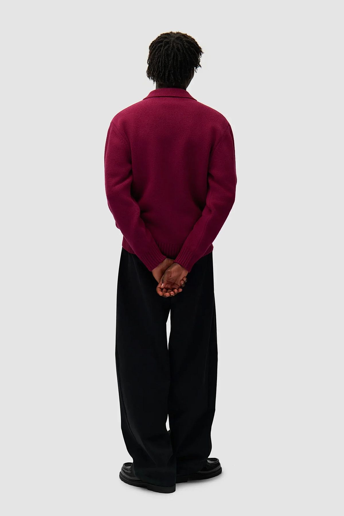 The Cardigan functions as a cozy extra layer that adds both style and comfort to your outfit. Made from premium wool blend, it features a striped design consisting of contrasting shades of bordeaux and cream. Finished with a full length zipper in the front and a bordeaux embroidery on the left chest.