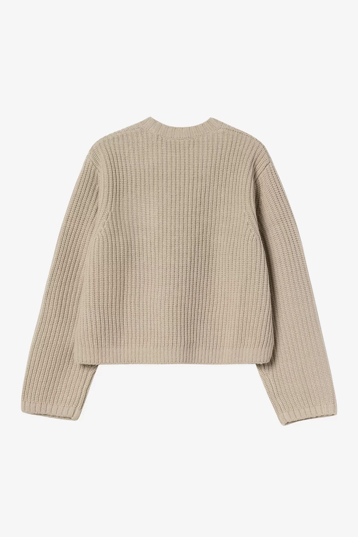 The Women’s Mira Sweater is knit from a blend of acrylic, wool, and nylon yarn. The style features fully-fashioned knitting at the armholes. A woven Square Label appears on the chest pocket.