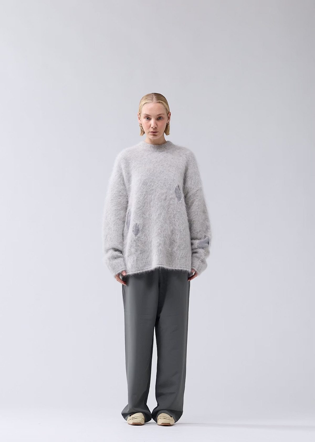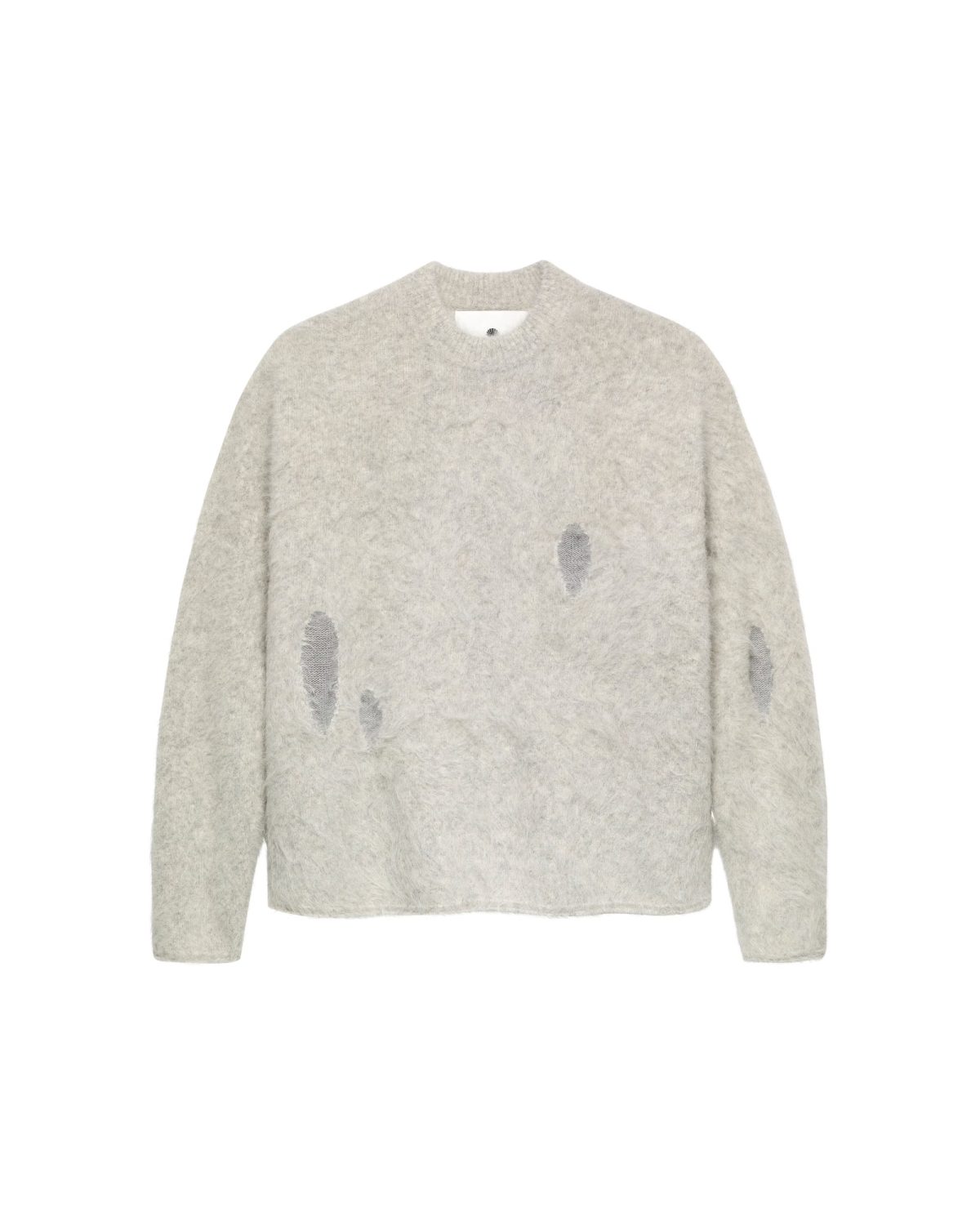 Experience ultimate comfort with this oversized crewneck sweater, crafted from a soft alpaca wool blend. Designed with subtle distressed details for a modern, edgy look, it features a bold shell logo intarsia on the back. Perfect as a standout piece or a cozy addition to your wardrobe.