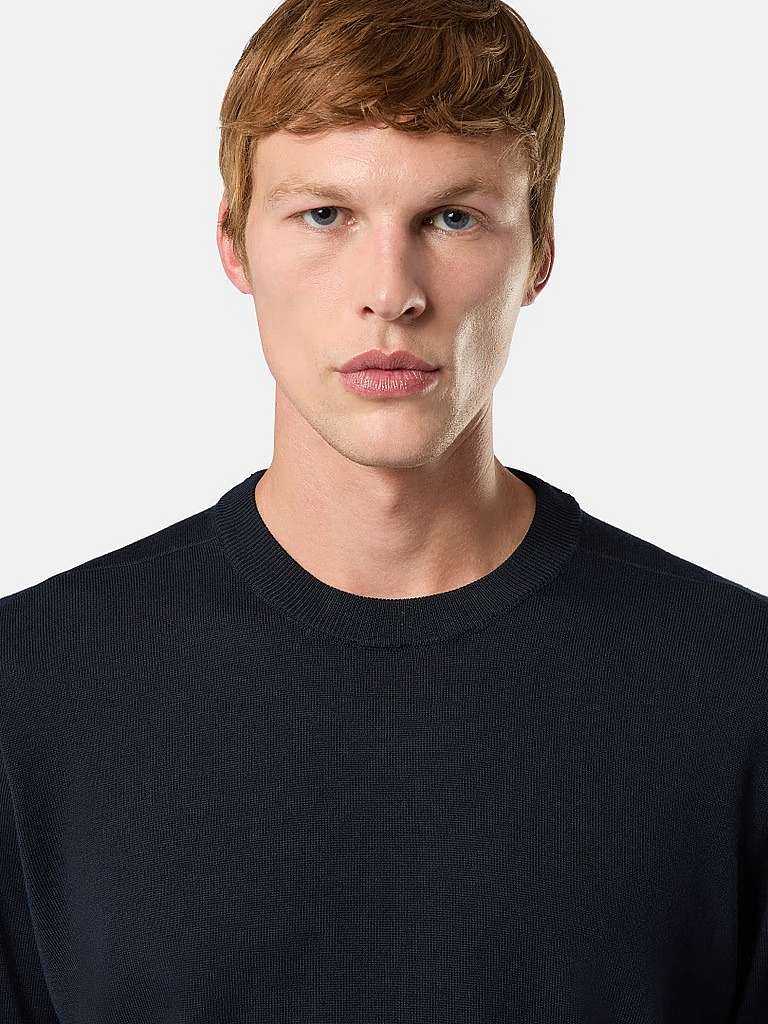 Knit crewneck jumper in light RWS pure wool featuring a ribbed neckline with raised stitch details on the back, and ribbed cuffs and bottom band. Gauge 14.