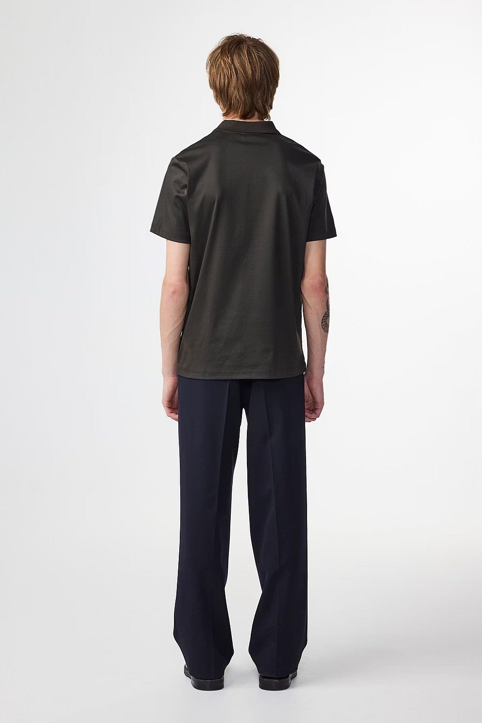 Open-collar polo crafted in smooth organic cotton interlock jersey with a soft, luxurious handfeel. Finished with a flat knitted collar and twin-needle stitching.