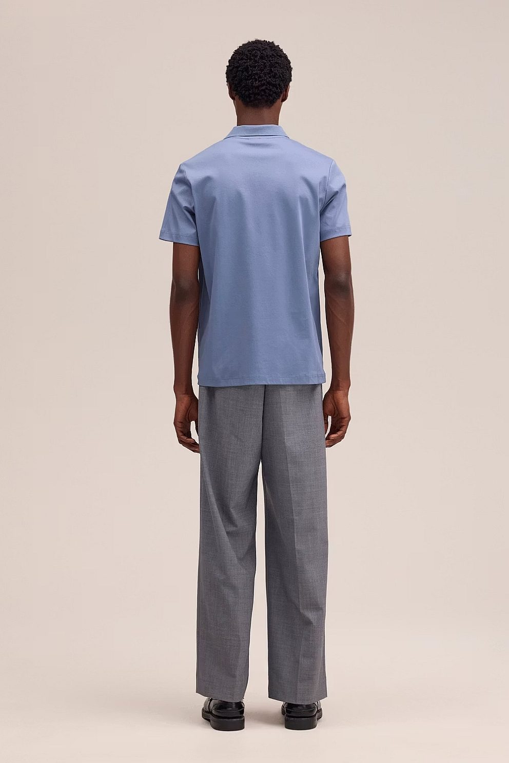 Stone Blue Open-collar polo crafted in smooth organic cotton interlock jersey with a soft, luxurious handfeel. Finished with a flat knitted collar and twin-needle stitching.