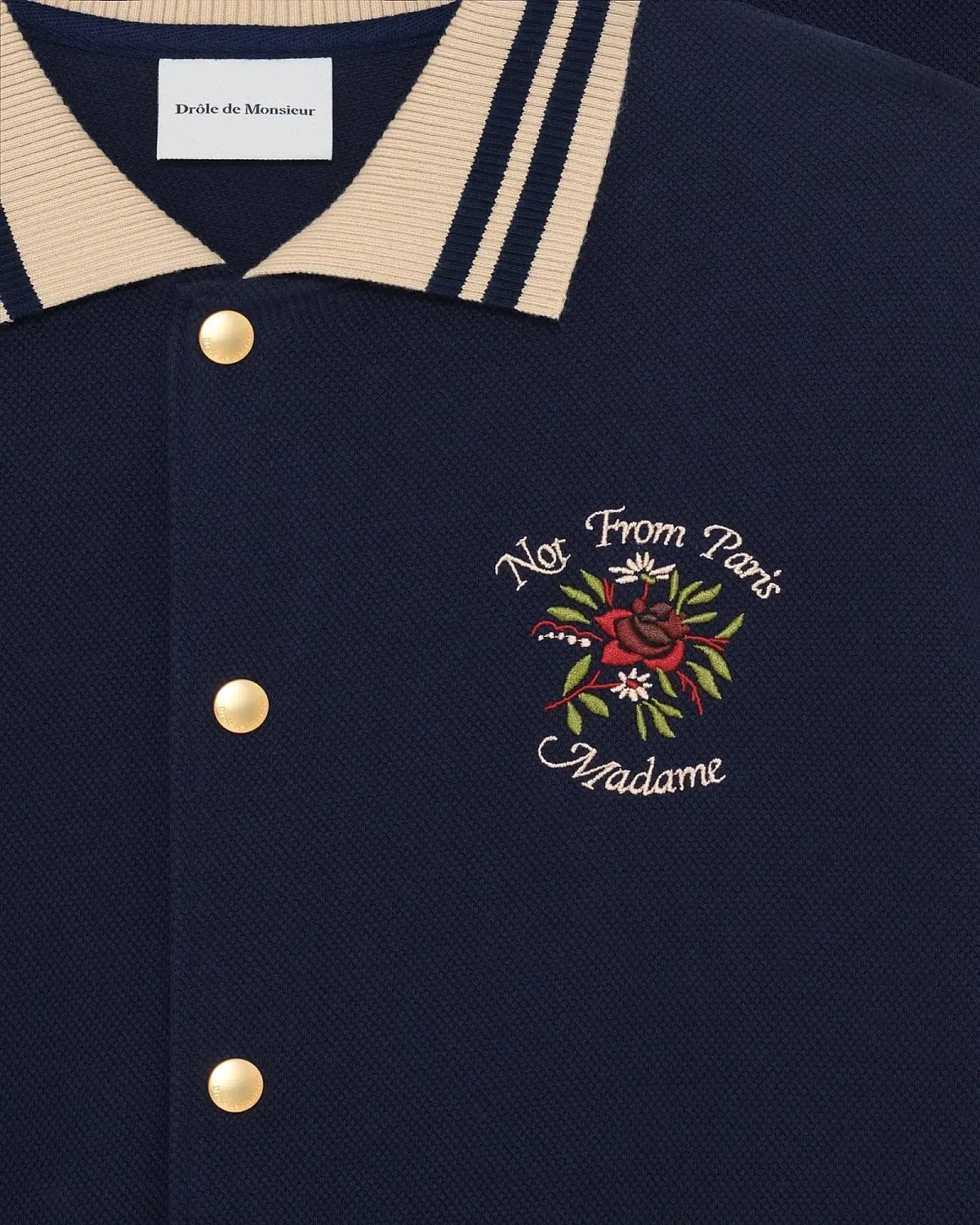 This navy short-sleeved shirt, made from 100% piqué cotton, features a Slogan Rose embroidery on the front and back. It has a contrasting ribbed collar and a snap-button closure with engraved buttons.