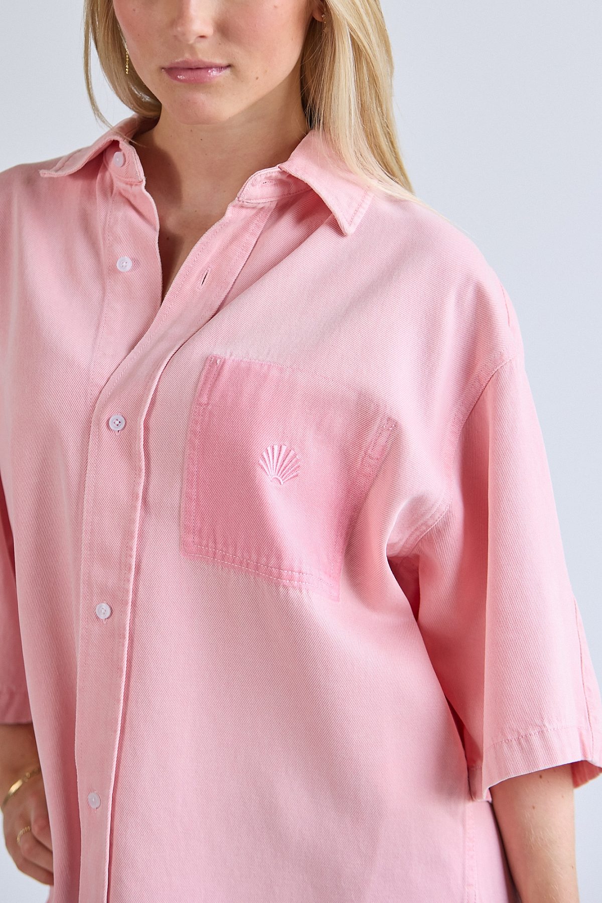 Button-up shirt is cut to a relaxed unisex fit with dropped shoulders and hip length. Complete with chest embroidery, chest pocket on the inside and centre front button-up closure. Made from cotton and lyocell fabric with washing.