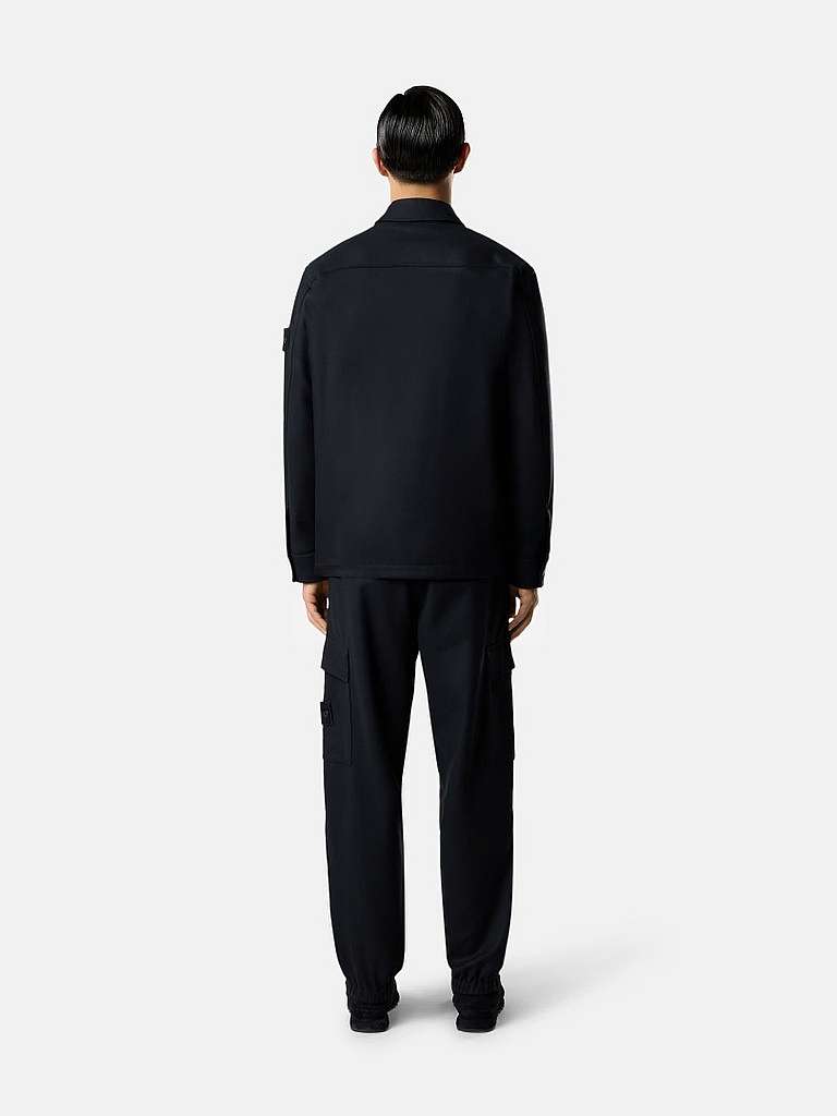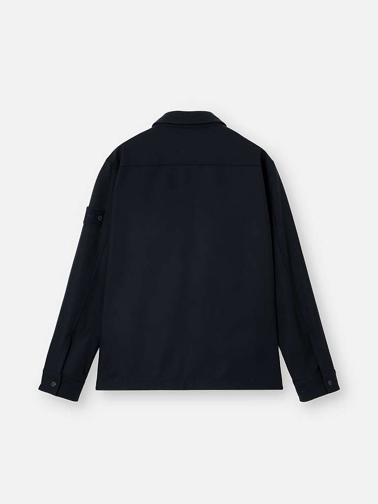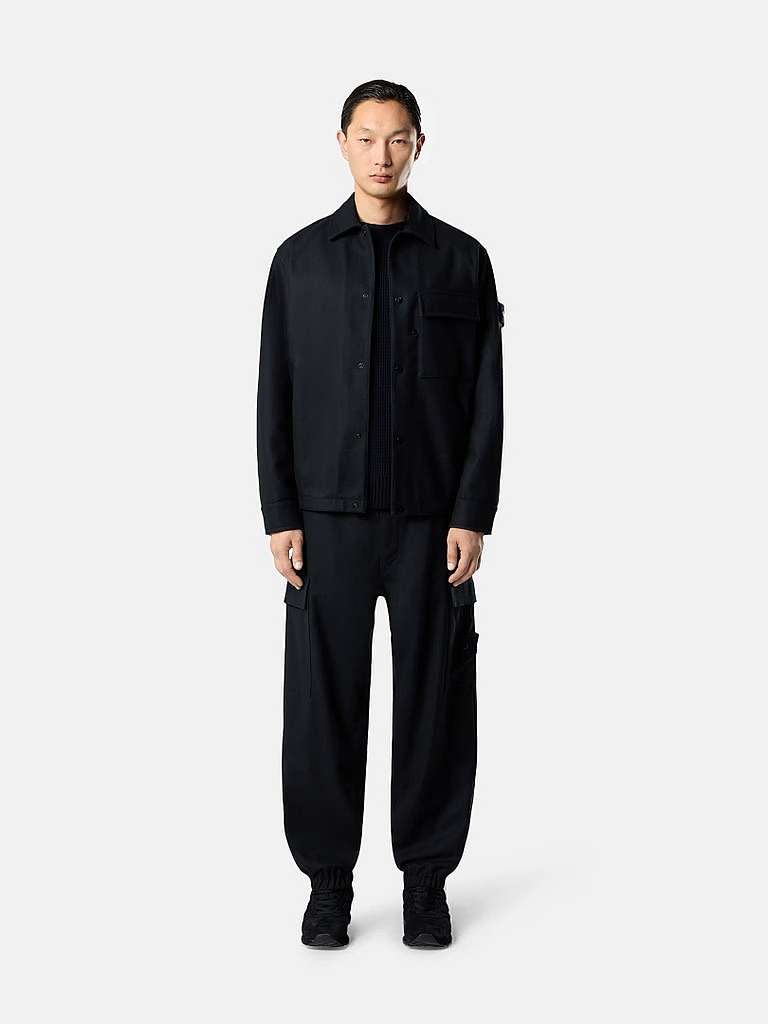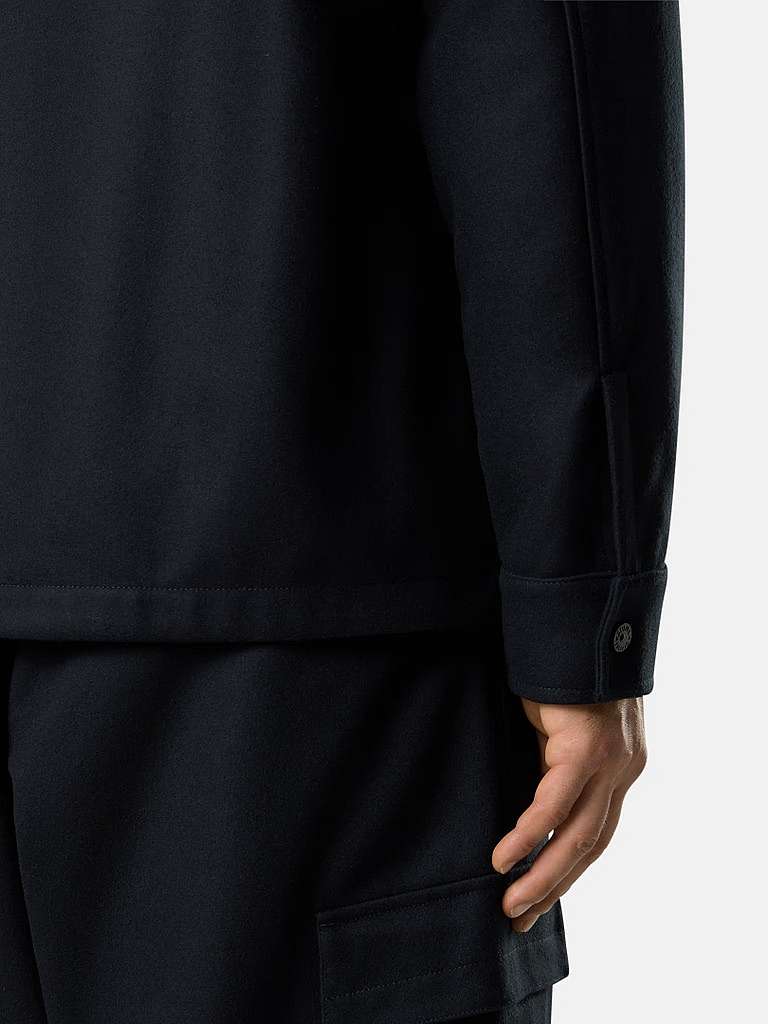 Overshirt in a carded wool nylon flannel with a chest pocket, internal pocket, snap cuffs, snap fastening, and nylon lining.