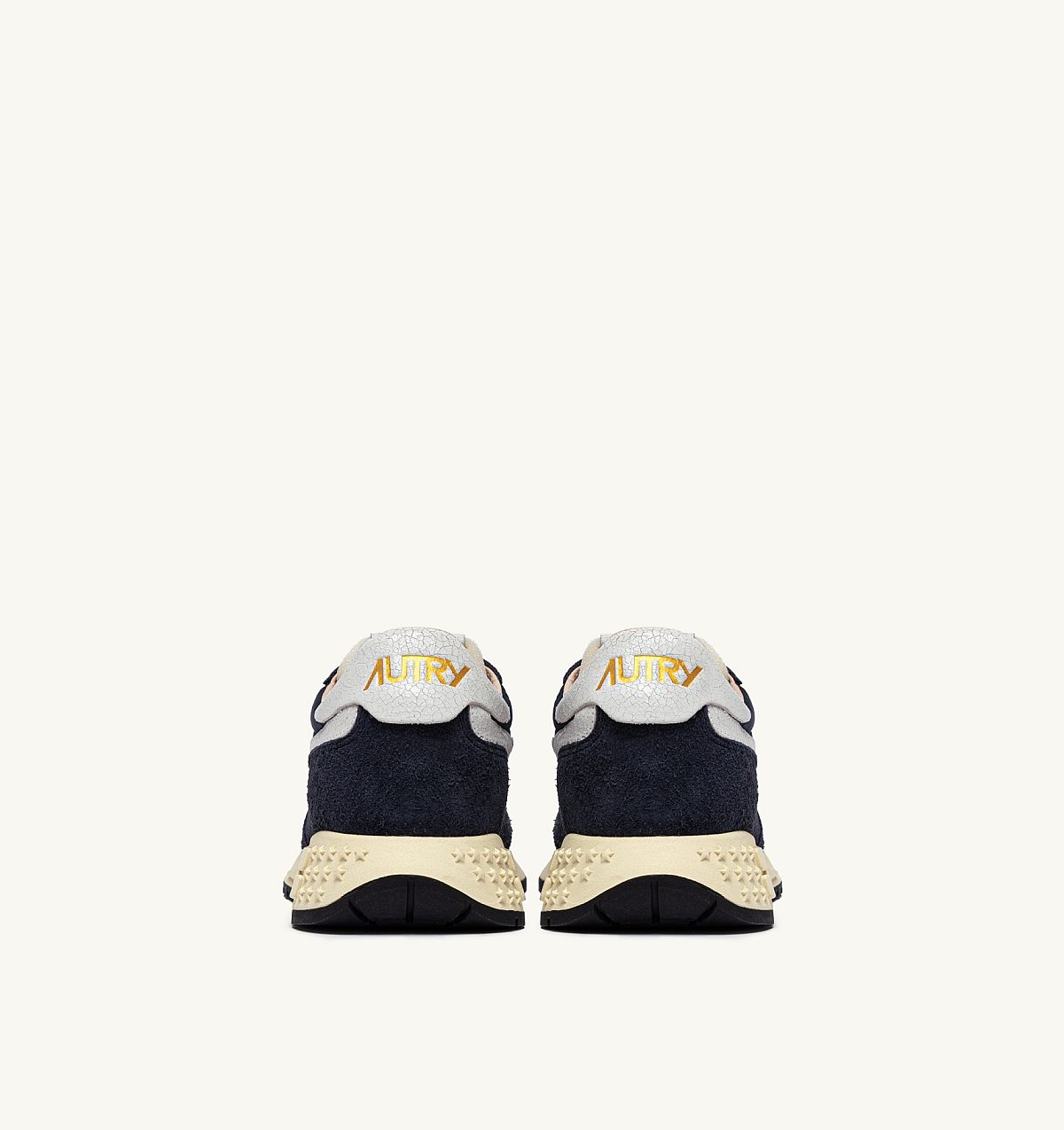 Sporty performance and metropolitan lifestyle. The men’s Reelwind sneakers explores street dynamism with a panel construction that combines nylon and suede in color matching blue tones, accented with crackle-effect white leather inserts.