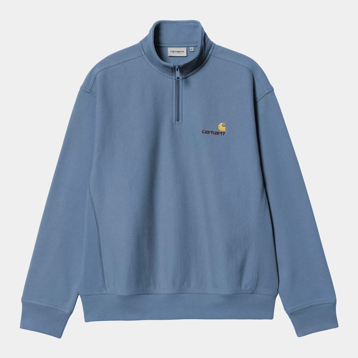 Sorrent Half Zip American Script Sweatshirt is constructed from a 12.3 oz cotton-polyester blend and brushed for extra softness and warmth, without losing breathability. The garment features a highneck with a zipper and a small logo. Appears in a loose, boxy silhouette.