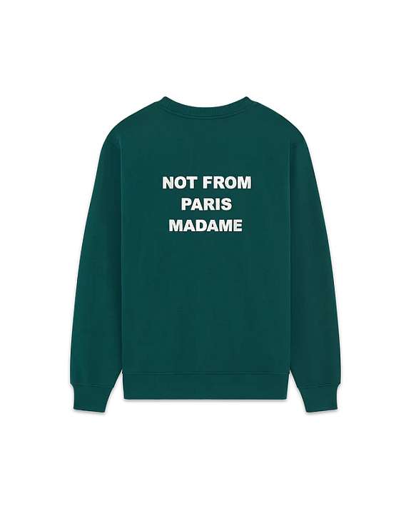 This dark green 100% cotton French terry sweatshirt with ribbed hem and cuffs is printed with the 'Not from Paris Madame' slogan on the front and embroidered on the back.