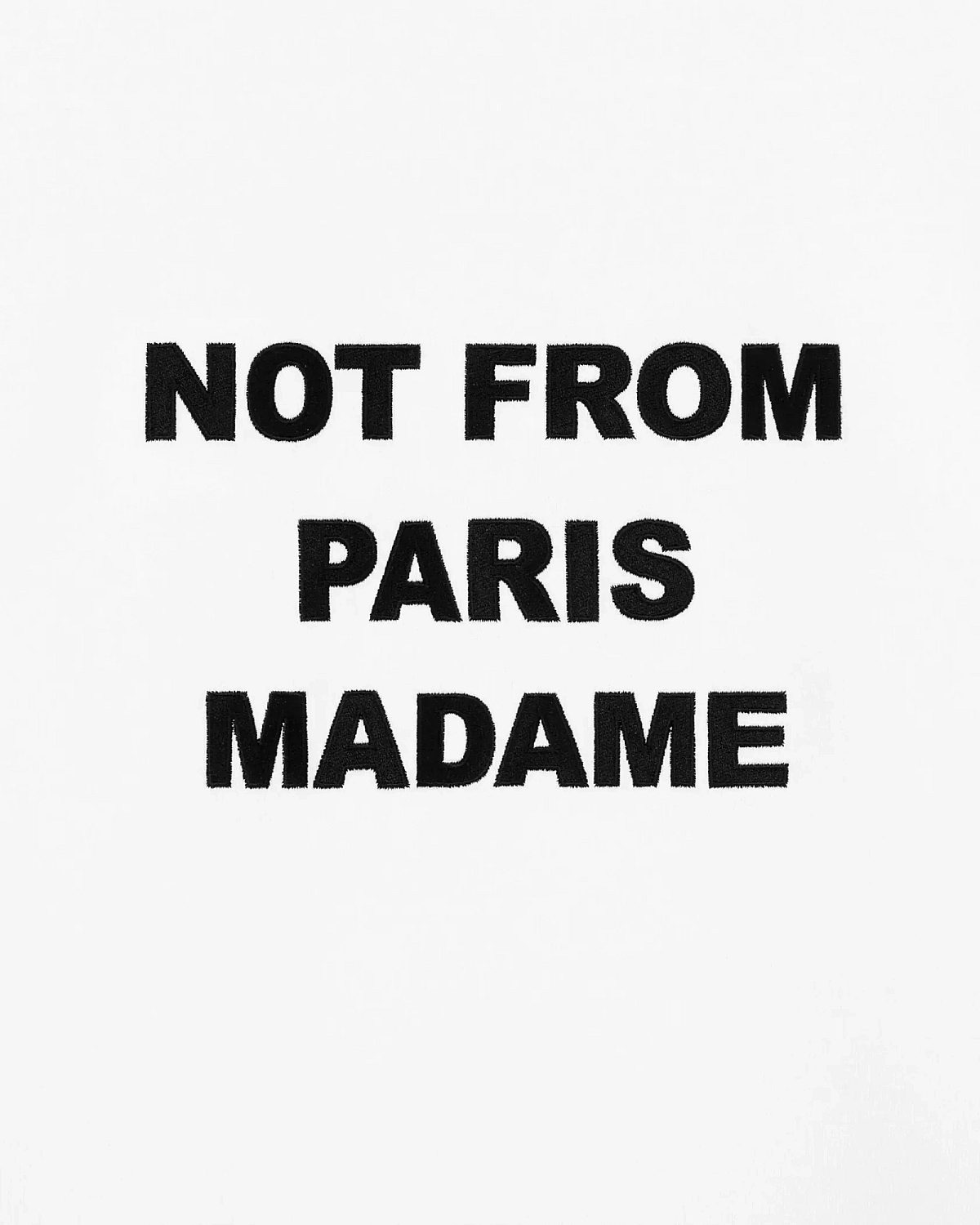 This white 100% cotton French terry sweatshirt with ribbed hem and cuffs is printed with the 'Not from Paris Madame' slogan on the front and embroidered on the back.