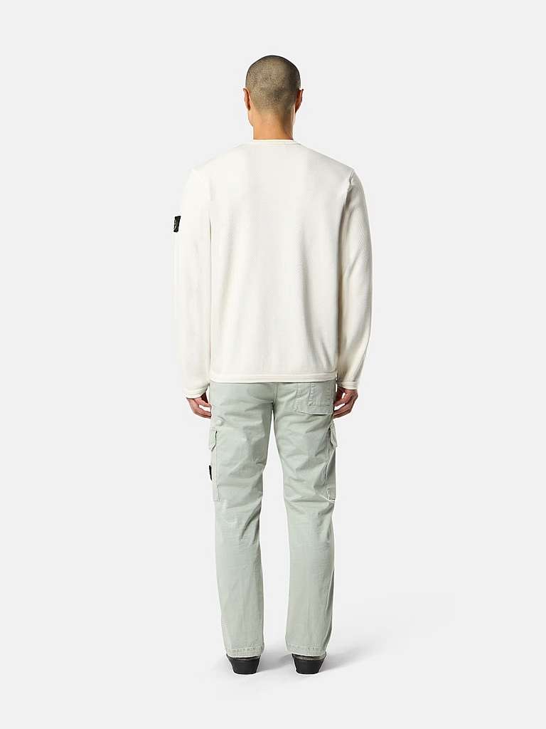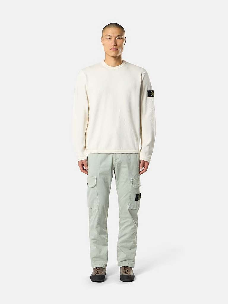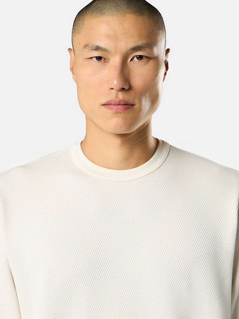 Ivory Crewneck sweatshirt in organic cotton fleece with mesh stitch, featuring elasticated ribbed trims and inserts under armholes. Heavyweight. Garment dyed.