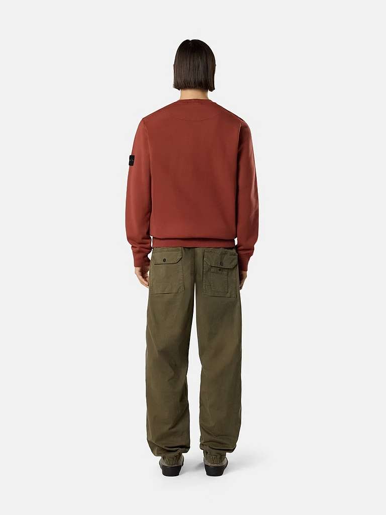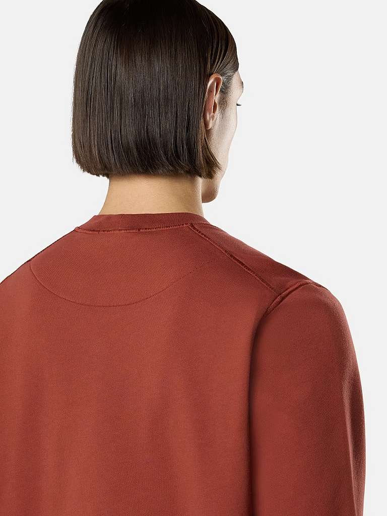 Crewneck sweatshirt in organic cotton fleece, featuring raglan sleeves, overlock seams, ribbed trims, and a lunette detail under the back neckline. Midweight. Garment dyed.
