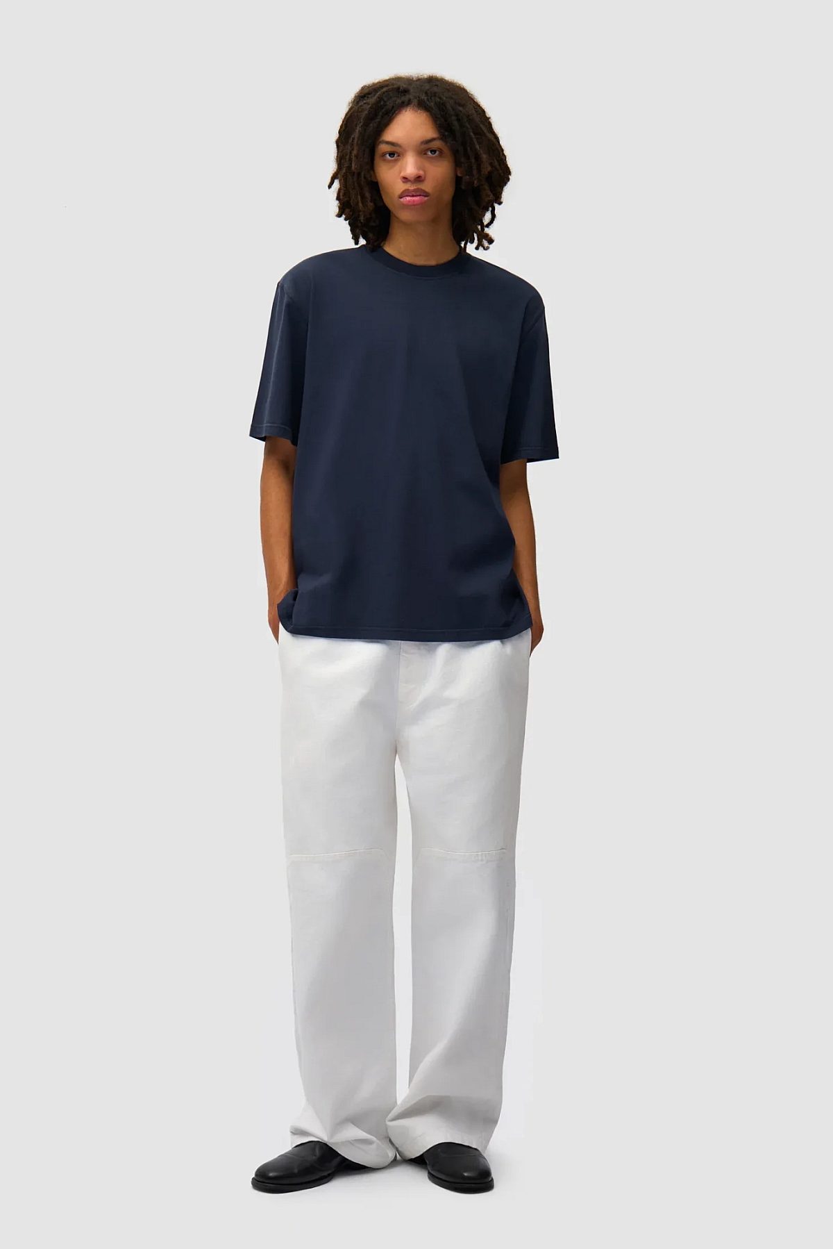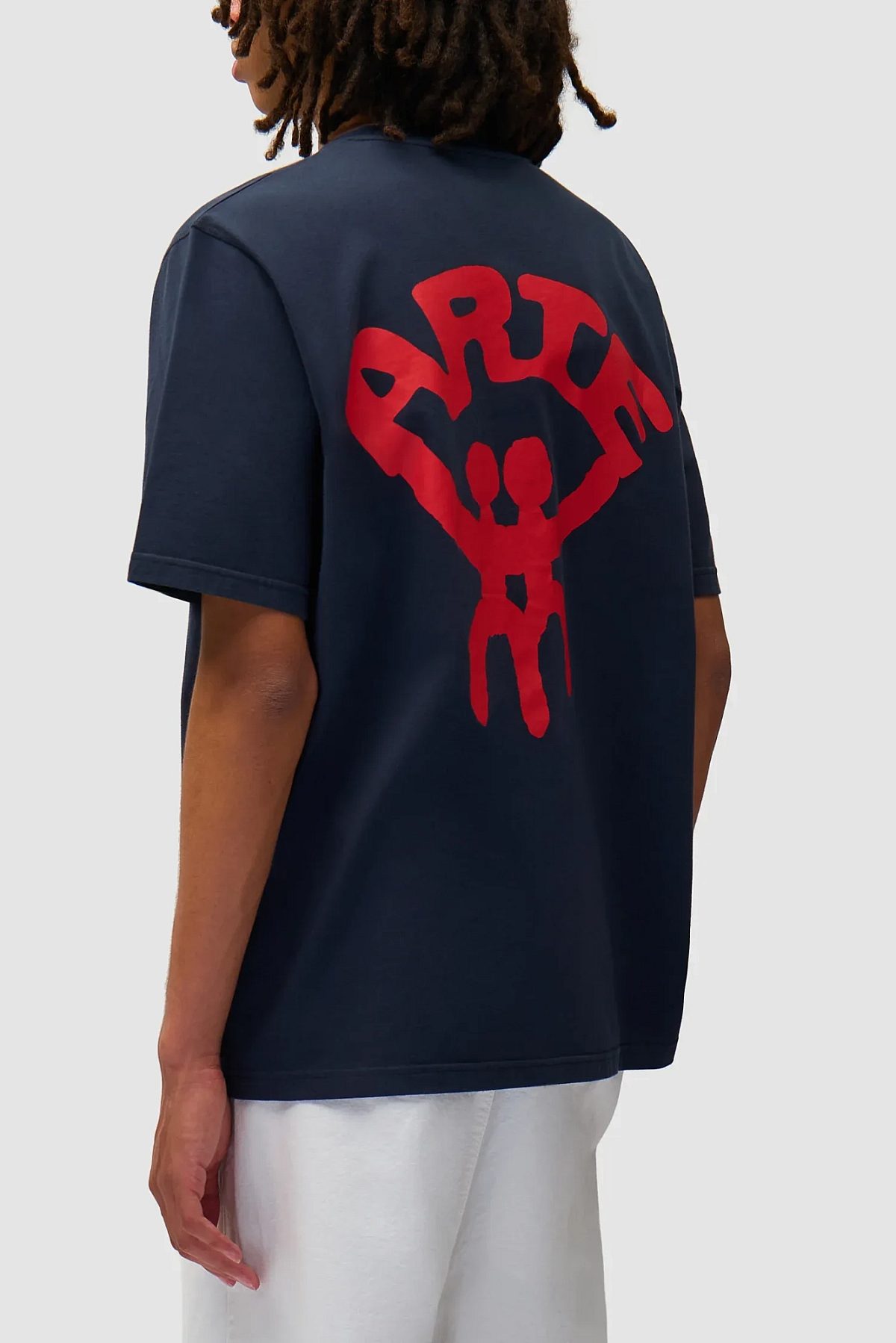 The T-shirt features an artwork screen-printed in red across the back that channels the theme of the collection. Made from premium heavyweight cotton, the navy T-shirt is soft to the touch with a slightly higher neckline and a relaxed fit.