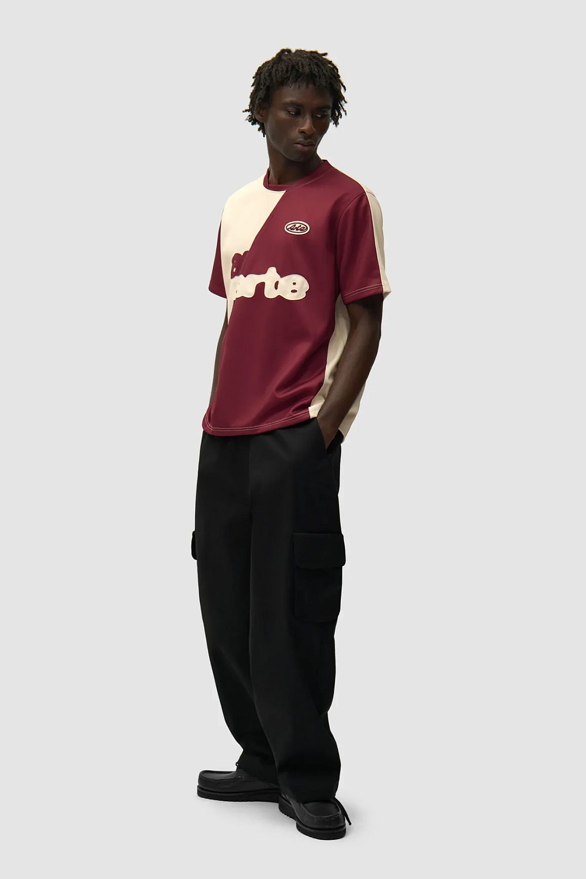 Crafted from premium nylon, the jersey is designed to channel the deconstructed and retrospective theme of the collection. Two logos across the chest seem distorted and are separated by a seam, dividing the piece in two colors. The jersey is completed by a seasonal athletic Arte logo patch embroidered on the left of the chest.