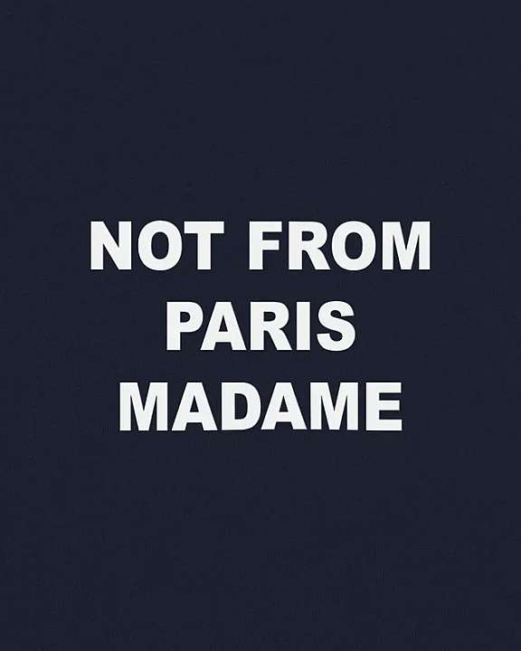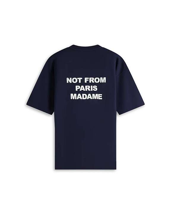 The Slogan tee. Made of 100% cotton interlock fabric, this navy t-shirt features a ribbed neckline and the 'Not from Paris Madame' slogan printed front and back.