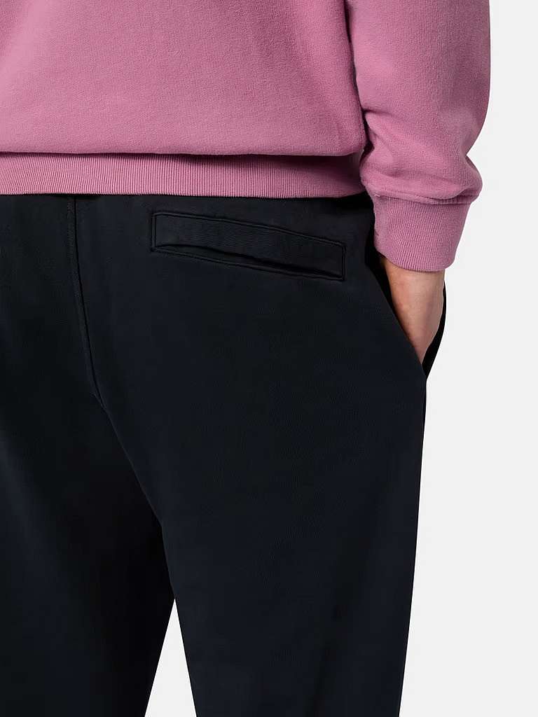 Navy cargo jogging pants in cotton fleece featuring a snap pocket in the back, patch pocket on the left leg with hidden zip, and drawstring waistband. Garment dyed.